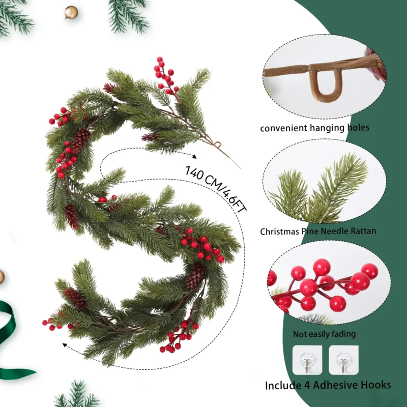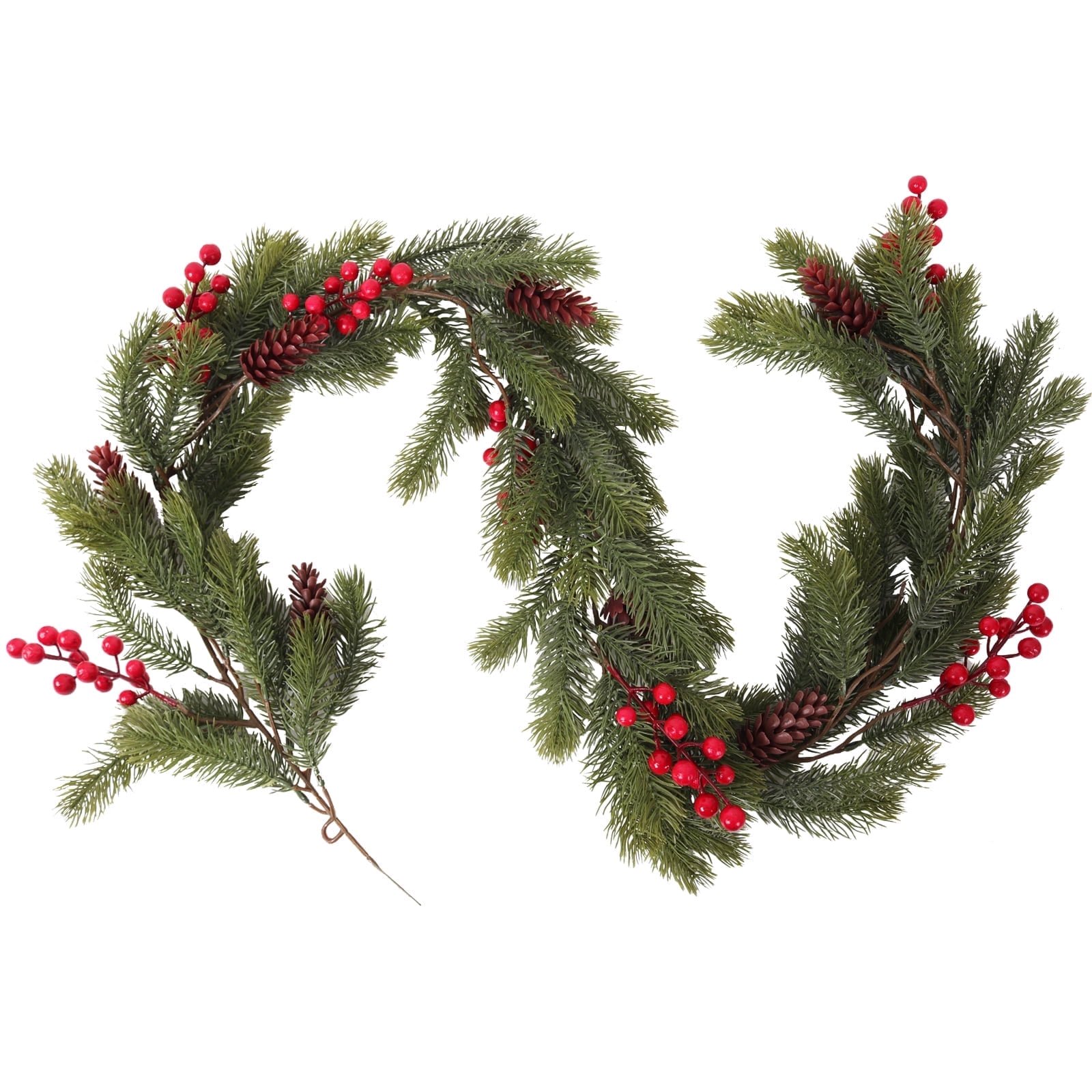RECUTMS 5Ft Artificial Christmas Garland Pine Needle with Red Berry Greenery Garland Holiday Outdoor Winter Christmas Decor (3 Colors)