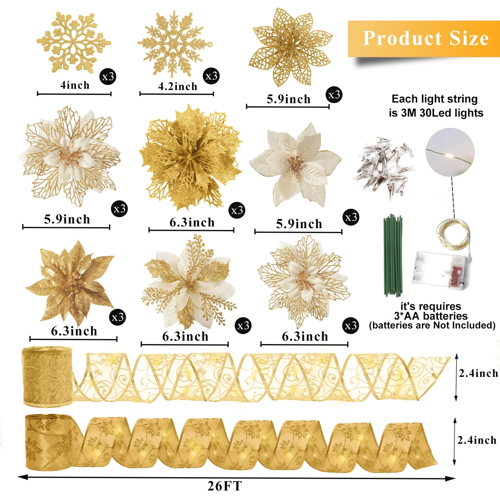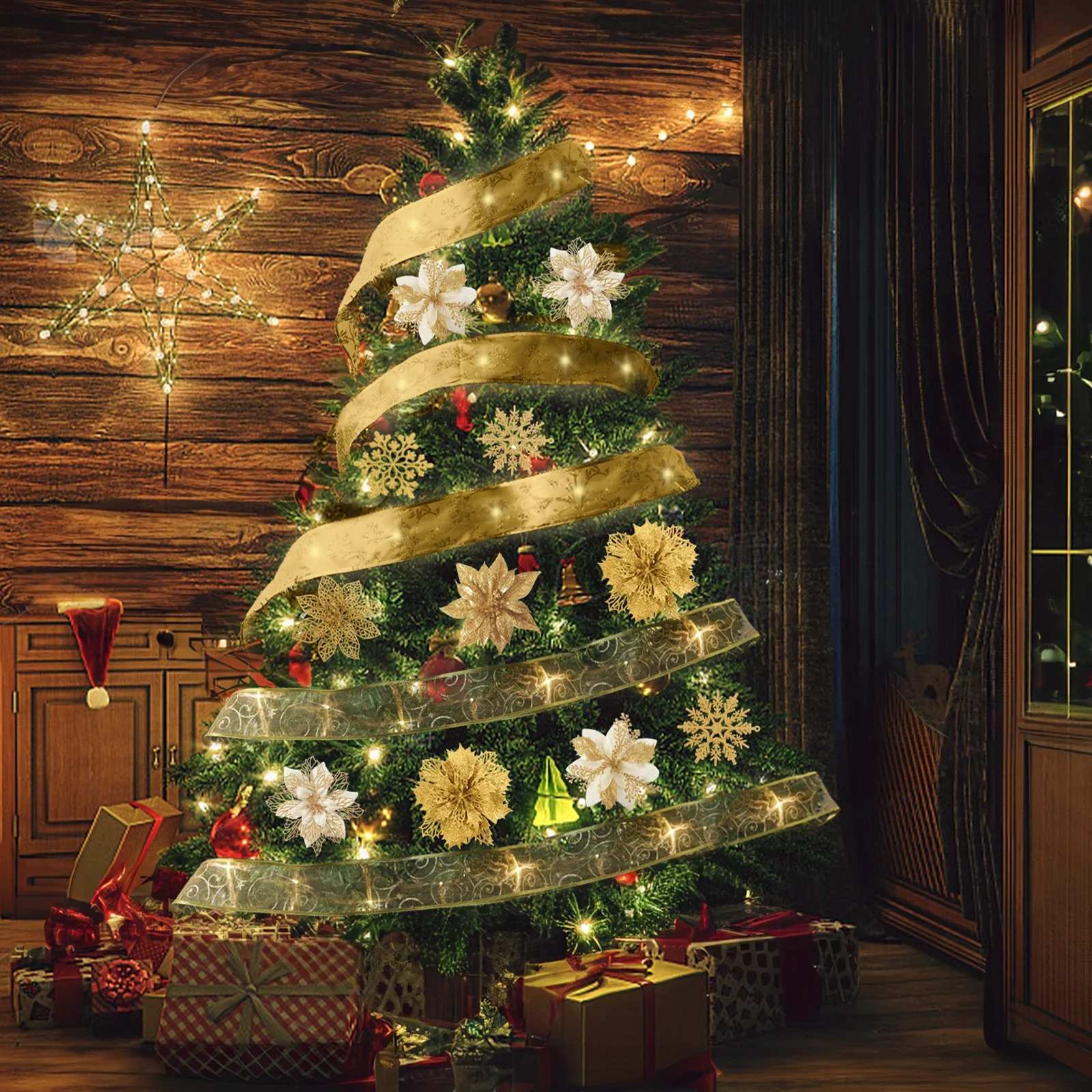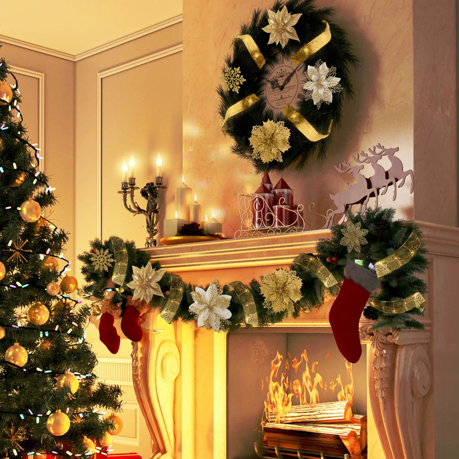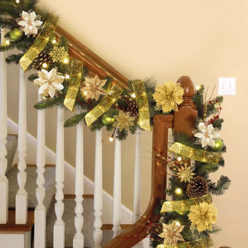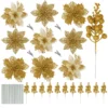 Elevate your Christmas decor with these stunning 21-piece set of glitter artificial poinsettia flowers. Crafted from high-quality PVC with a sparkling glitter finish, these lightweight yet durable flowers can be easily inserted into your Christmas tree or other holiday decorations. Suitable for a variety of festive occasions, including Christmas parties, weddings, and birthdays, these versatile poinsettia flowers will add a touch of elegance and warmth to your seasonal celebrations. The set includes 21 poinsettia flowers, 21 clips, 2 rolls of ribbon, a 3-meter light string, and 6 snowflakes, providing everything you need to create a truly enchanting holiday display.